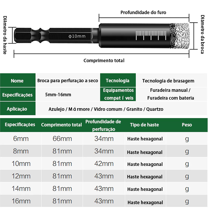 • Durabilidade superior: material HSS (High Speed Steel) com ponta de diamante brasado.